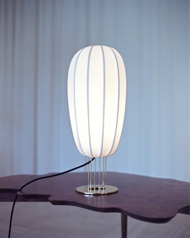 Five years later, Flight was enhanced and manufactured in collaboration with Flos. Its design was further developed into a collection comprising a desk lamp, a suspension light and a ceiling-mounted light using the cocoon technique instead of the original silk shade.