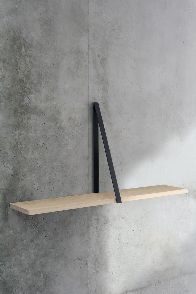The shelf is available in solid natural oak with matte varnish or black gloss finish, while the triangular shelf support comes in black nickel-plated bronze or polished solid brass.