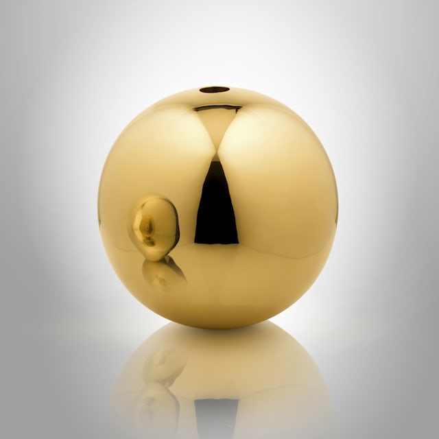 The Ball Vase has the same diameter as a bowling ball, with holes recalling those that allow the player to grip it. The vase is available in three models, each with a different distribution of holes arranged in awkward and dysfunctional configurations – one of the three holes that would be necessary for grip is always missing. Presented in polished brass, the spherical surface acts as a mirror, reflecting the entire room in which they are placed.