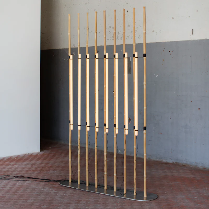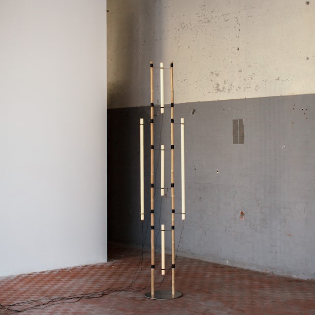 The backbone of the works’ realization is the bamboo, a new material for Anastassiades’ studio, which represents a departure from its usual language of geometric, controlled forms while the base is made of poured pewter, a metal chosen for its low melting point. The works produced for the exhibition embrace the material’s inherent irregularity, paired with an overall language of repeating, iterative configurations. Along with the use of natural materials such as bamboo or the linen thread, other details that do not try to hide the workings of the pieces are present, such as the exposed holders for the bulbs or the exposed connections and cables, elements that emphasize the dialogue between the components eliminating any possible hierarchy. According to Anastassiades’ minimalist aesthetic, the bulbs have the shape of pure cylinders of glass, which inevitably evoke the emblematic neon sculptures by Dan Flavin realized in the ‘60s.