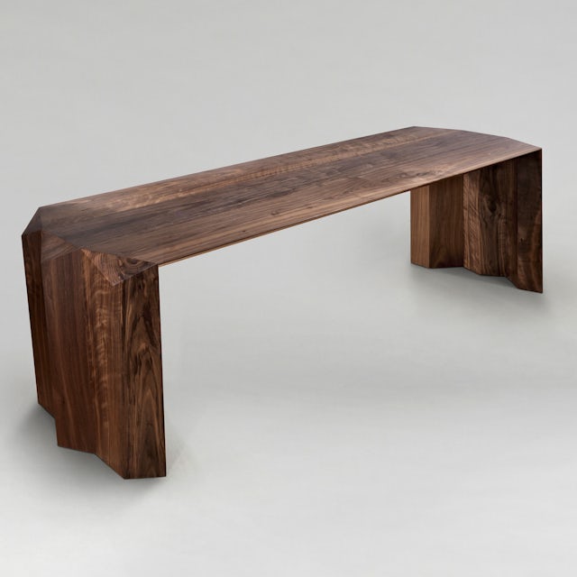 Originally conceived for the designer’s own home, this table is constructed using three triangular sectioned planks as a continuous surface between the sides and the tabletop. The section is mirrored on the outside of the vertical sides and expressed through a series of prismatic cuts, allowing no head to exist at the ends of the table.
