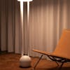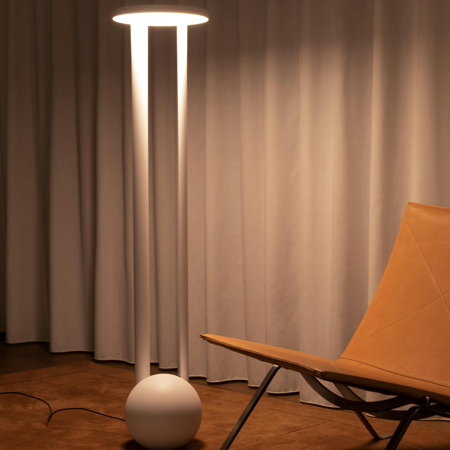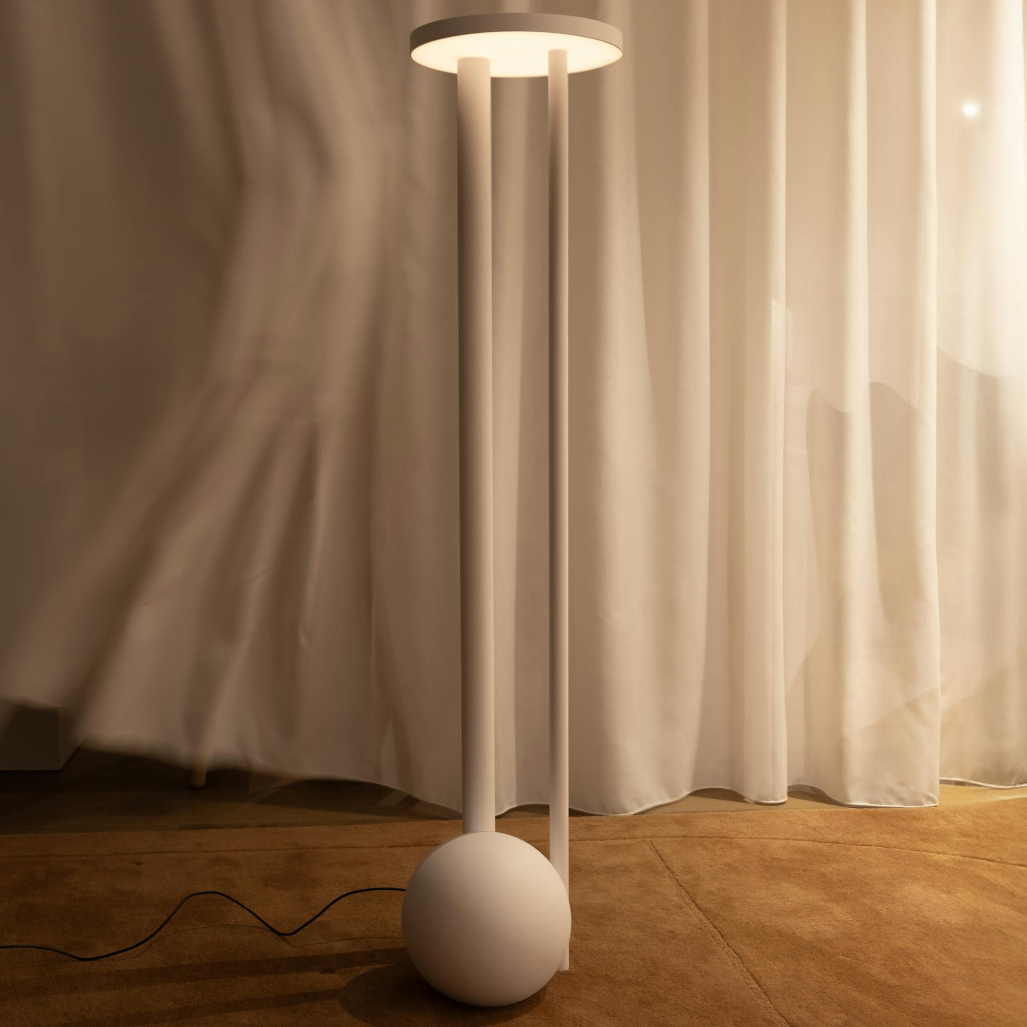 The Composition series includes a floor and table lamp. They consist of sculptural, elementary forms stacked to create simple, balanced compositions. Each fixture is formed of two cylindrical legs balancing a circular disk, with the Floor Composition grounded by a solid sphere. Illumination is through a bespoke LED circuit with a perspex diffuser, which softly distributes the light downward.