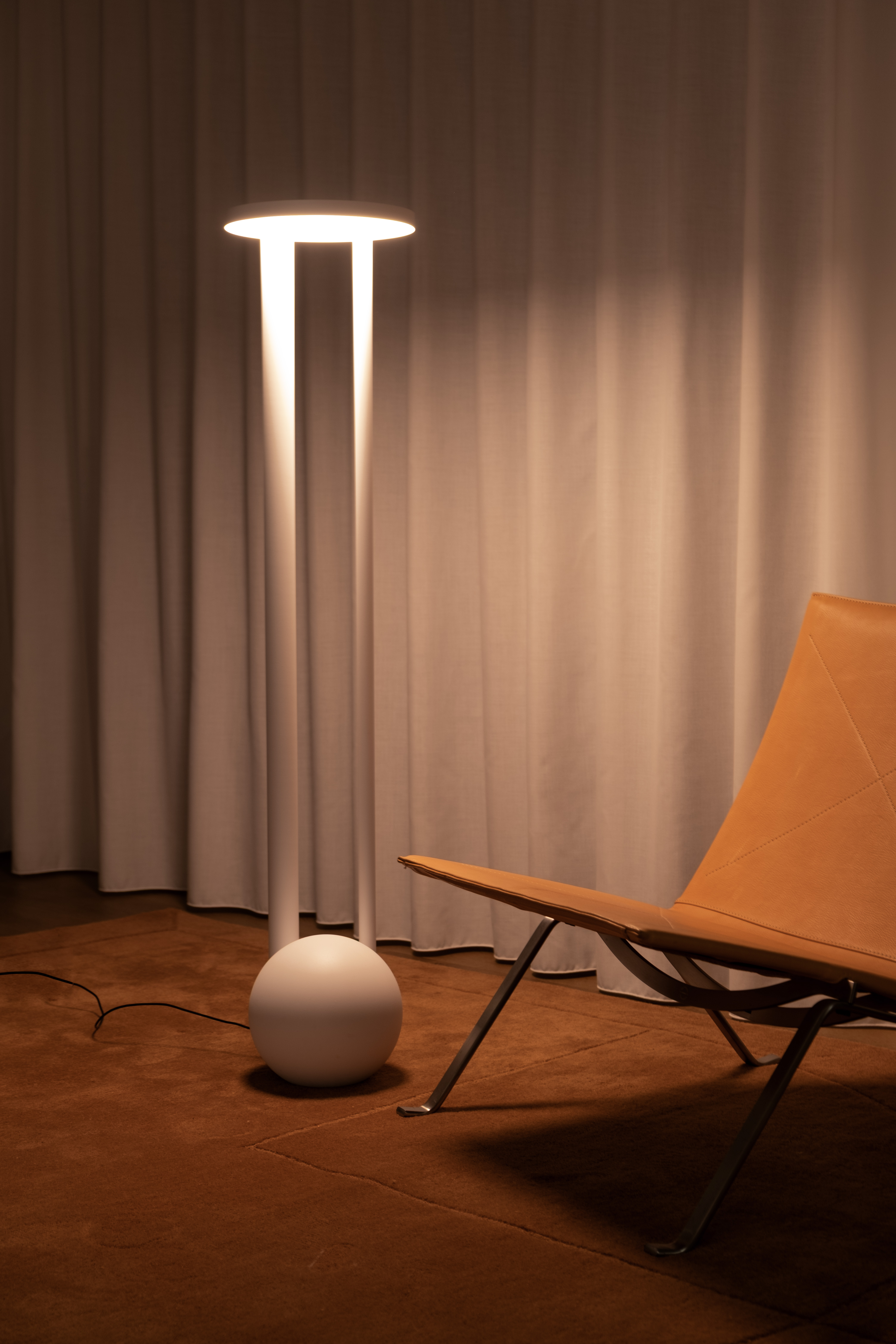 The Composition series includes a floor and table lamp. They consist of sculptural, elementary forms stacked to create simple, balanced compositions. Each fixture is formed of two cylindrical legs balancing a circular disk, with the Floor Composition grounded by a solid sphere. Illumination is through a bespoke LED circuit with a perspex diffuser, which softly distributes the light downward.