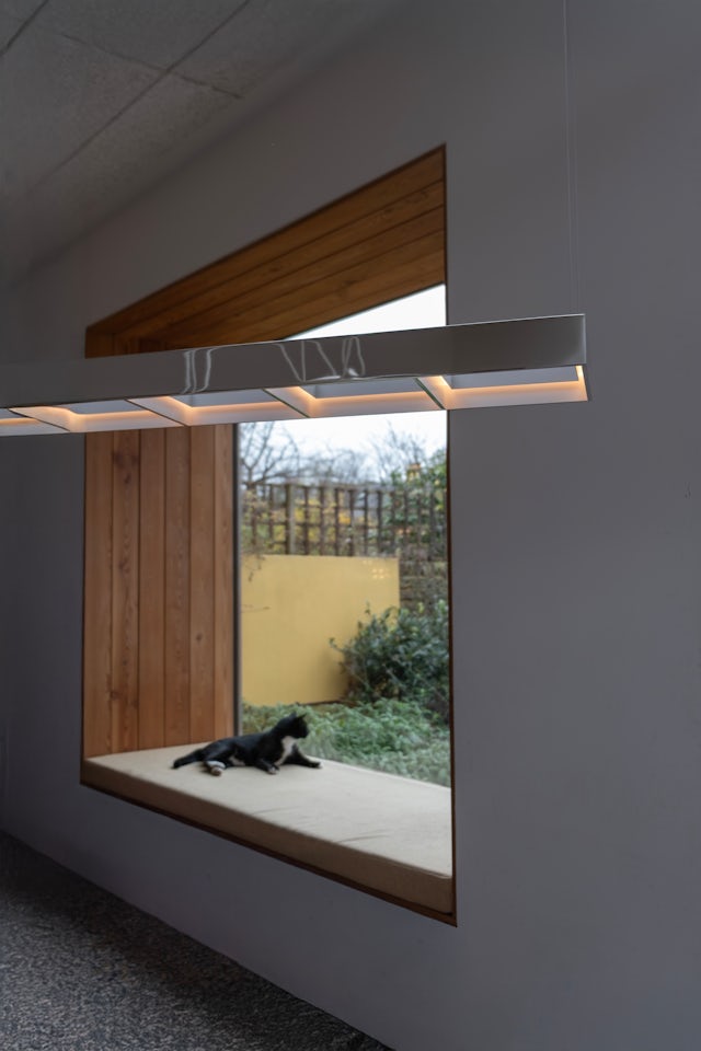 Referencing the ubiquitous office ceiling light, familiar for its functional, box-like form, and drawing inspiration from Ellsworth Kelly’s Windows series, Frame emphasises strong horizontality within a precise grid format, emitting a dimmable warm glow.