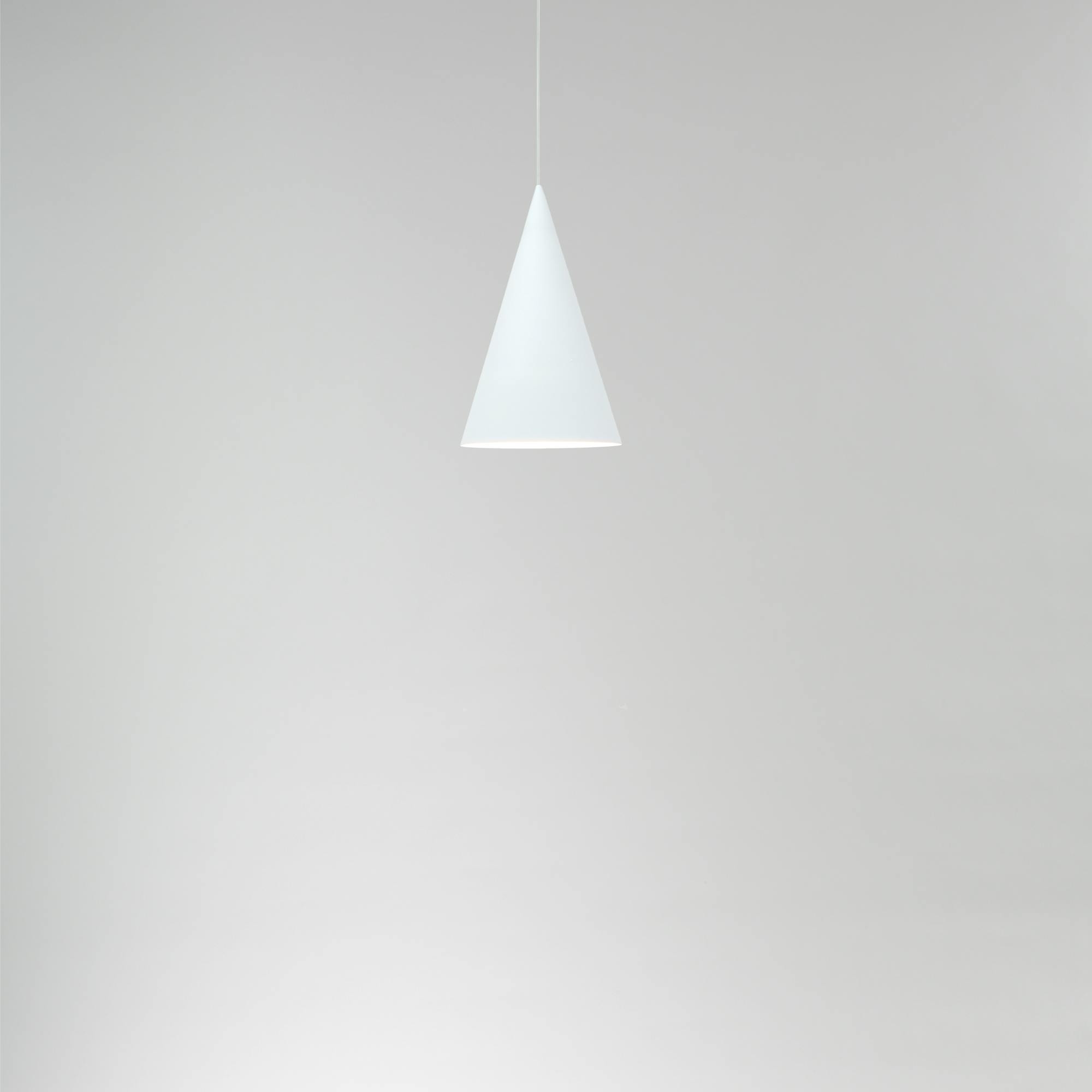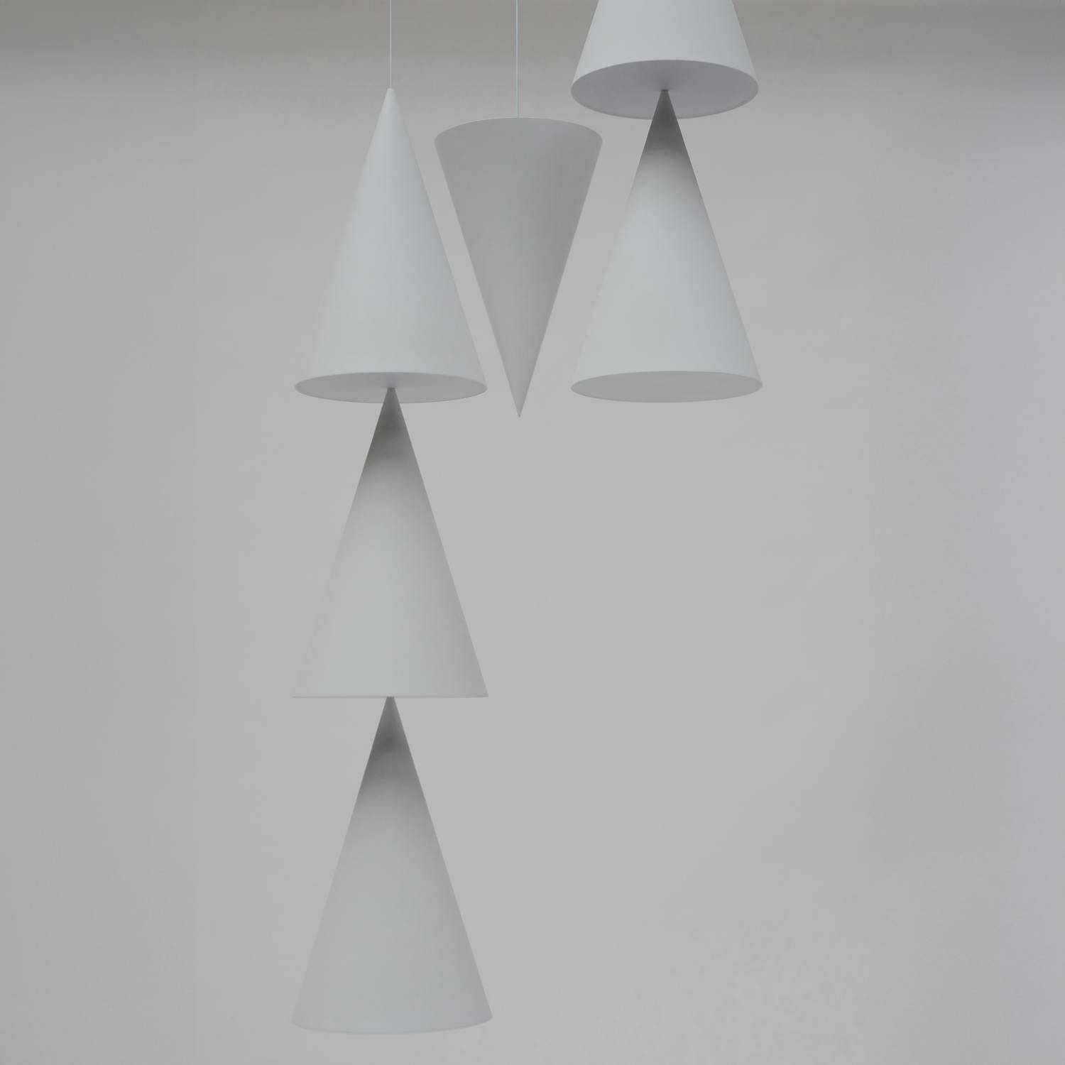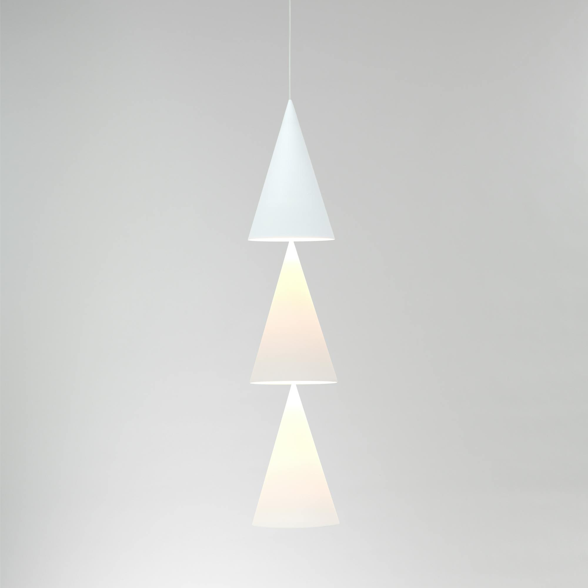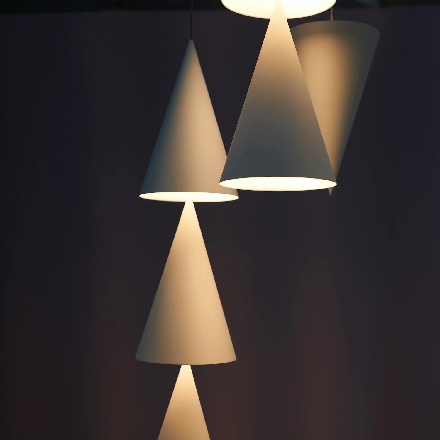 Peaks is a family of pendants, composed of a string of elongated cones in different configurations. The graded shading on the curved surface of each cone is as much of a feature as the projected beams emitted from each cone. It can be displayed as a single, double or triple arrangement, pointing up or down depending on the preferred direction of light. An identical inverted cone acts as a rose attached to the ceiling. When the light is off, the forms appear very schematic, as if borrowed from a geometric still life. When on, the shading changes, as light casts along the curved surface.