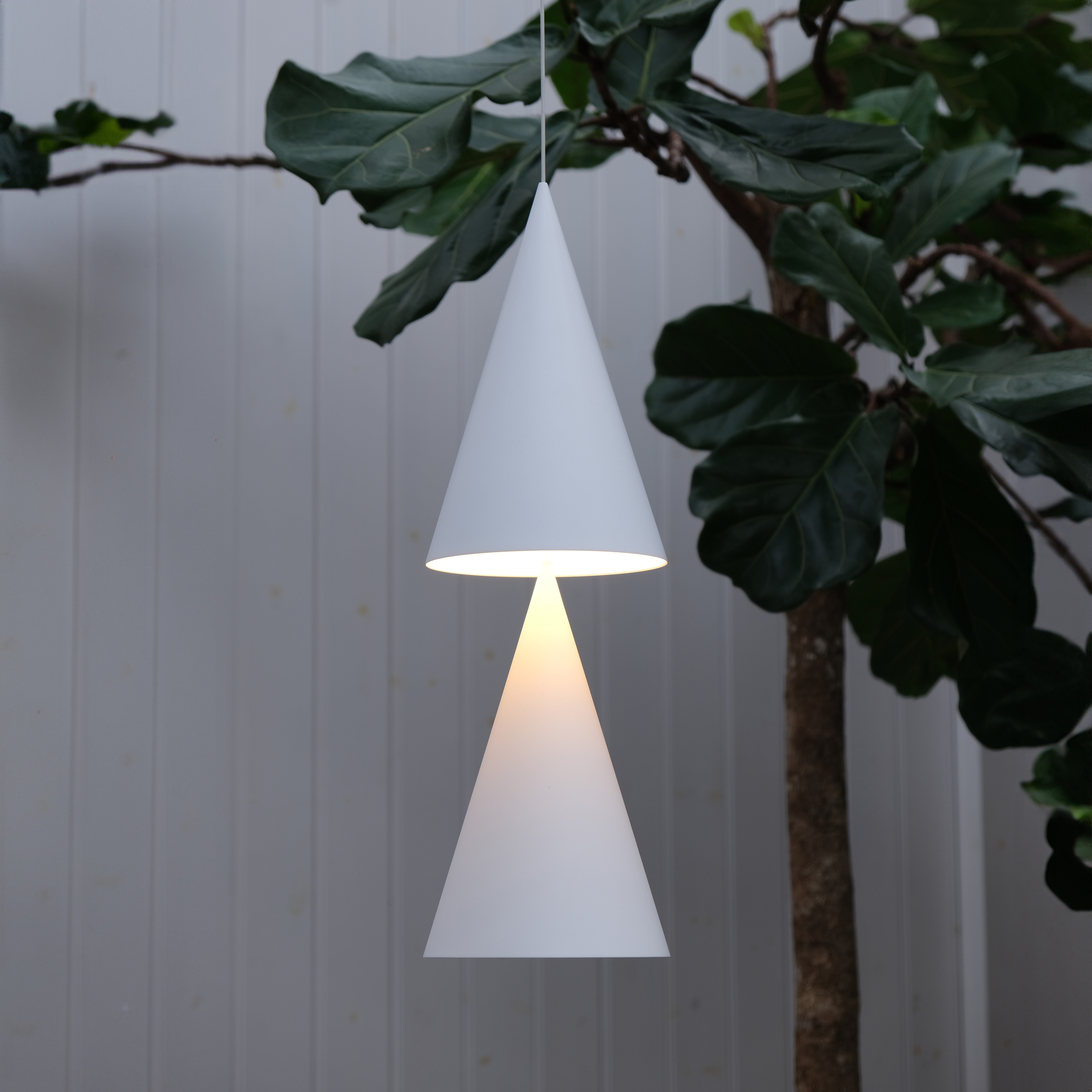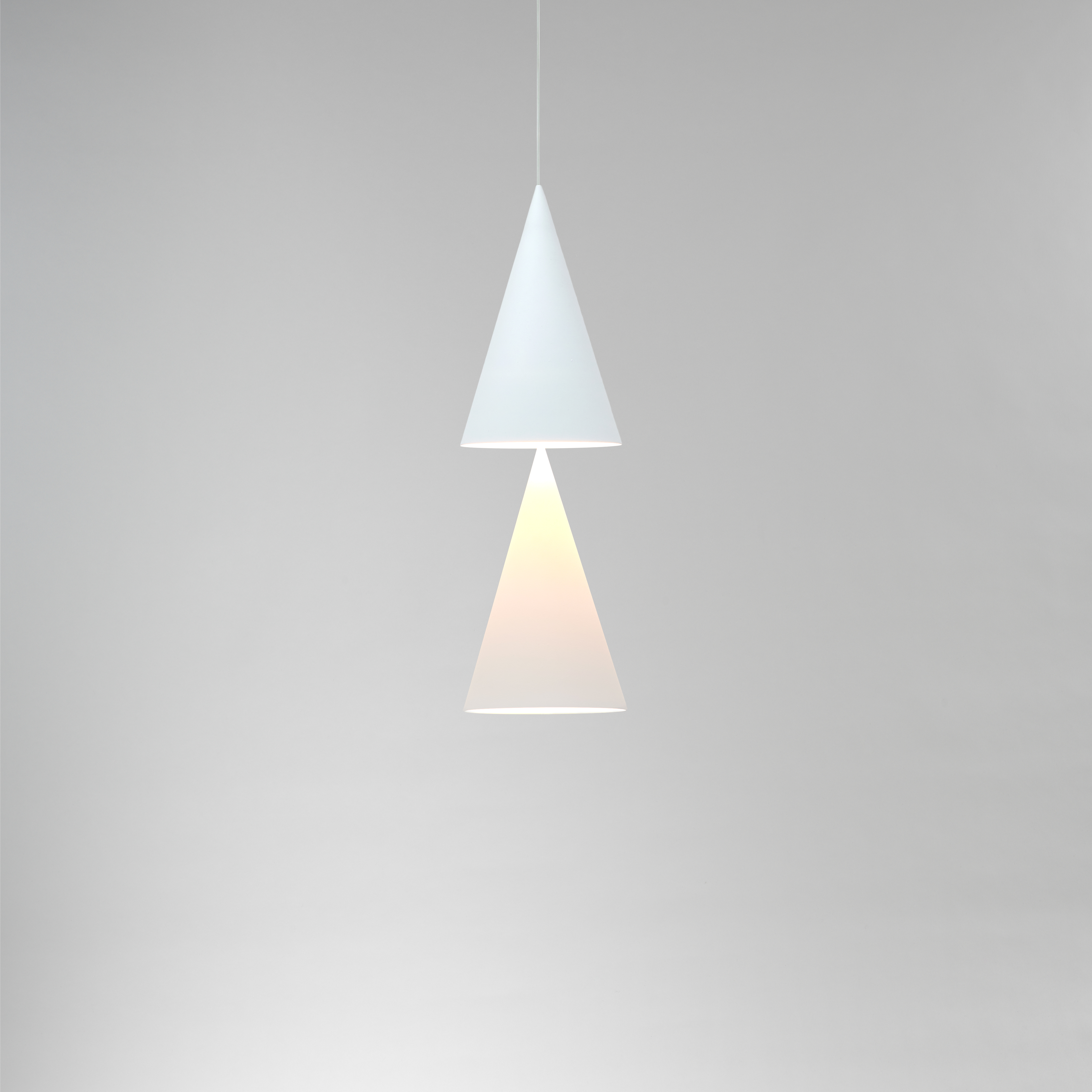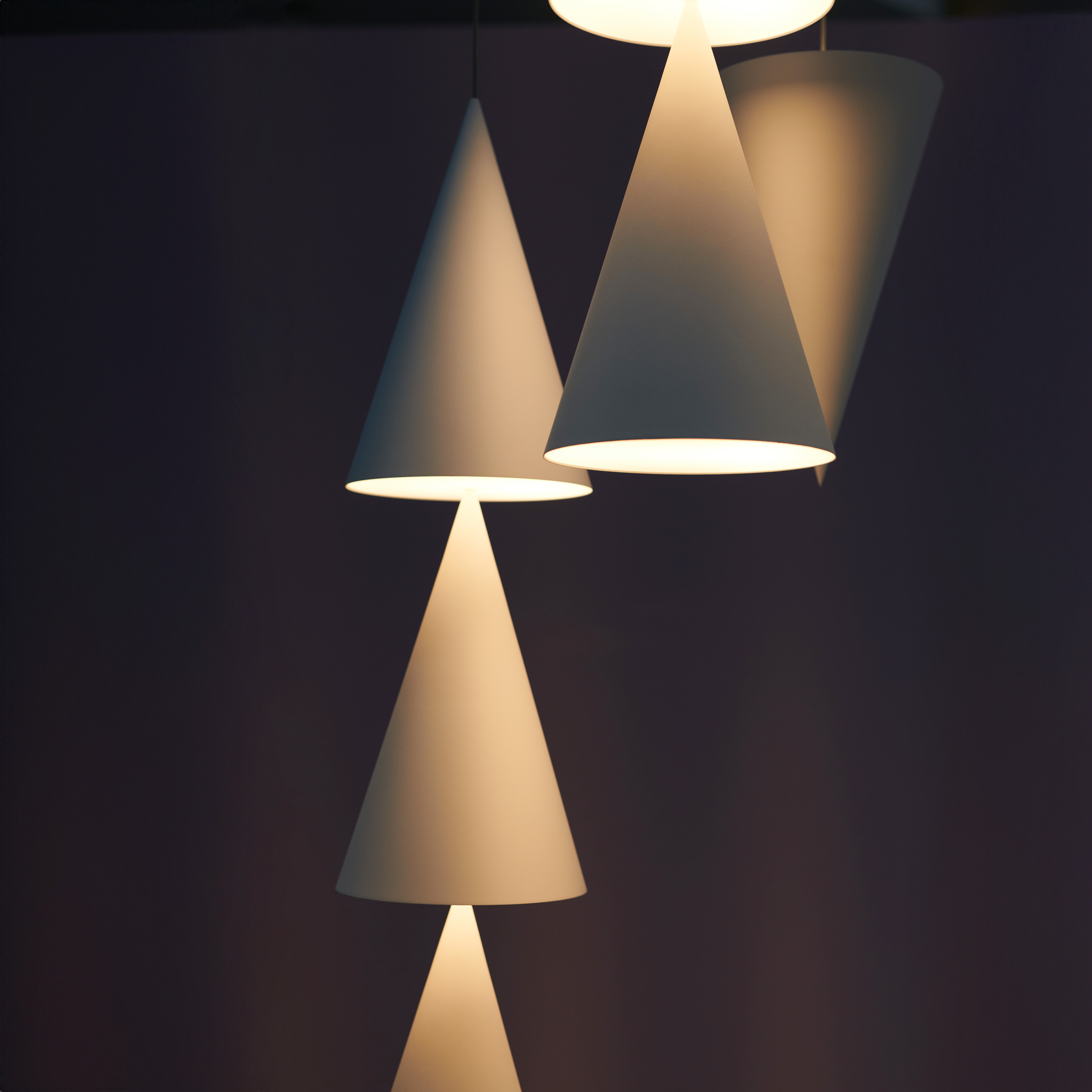 Peaks is a family of pendants, composed of a string of elongated cones in different configurations. The graded shading on the curved surface of each cone is as much of a feature as the projected beams emitted from each cone. It can be displayed as a single, double or triple arrangement, pointing up or down depending on the preferred direction of light. An identical inverted cone acts as a rose attached to the ceiling. When the light is off, the forms appear very schematic, as if borrowed from a geometric still life. When on, the shading changes, as light casts along the curved surface.