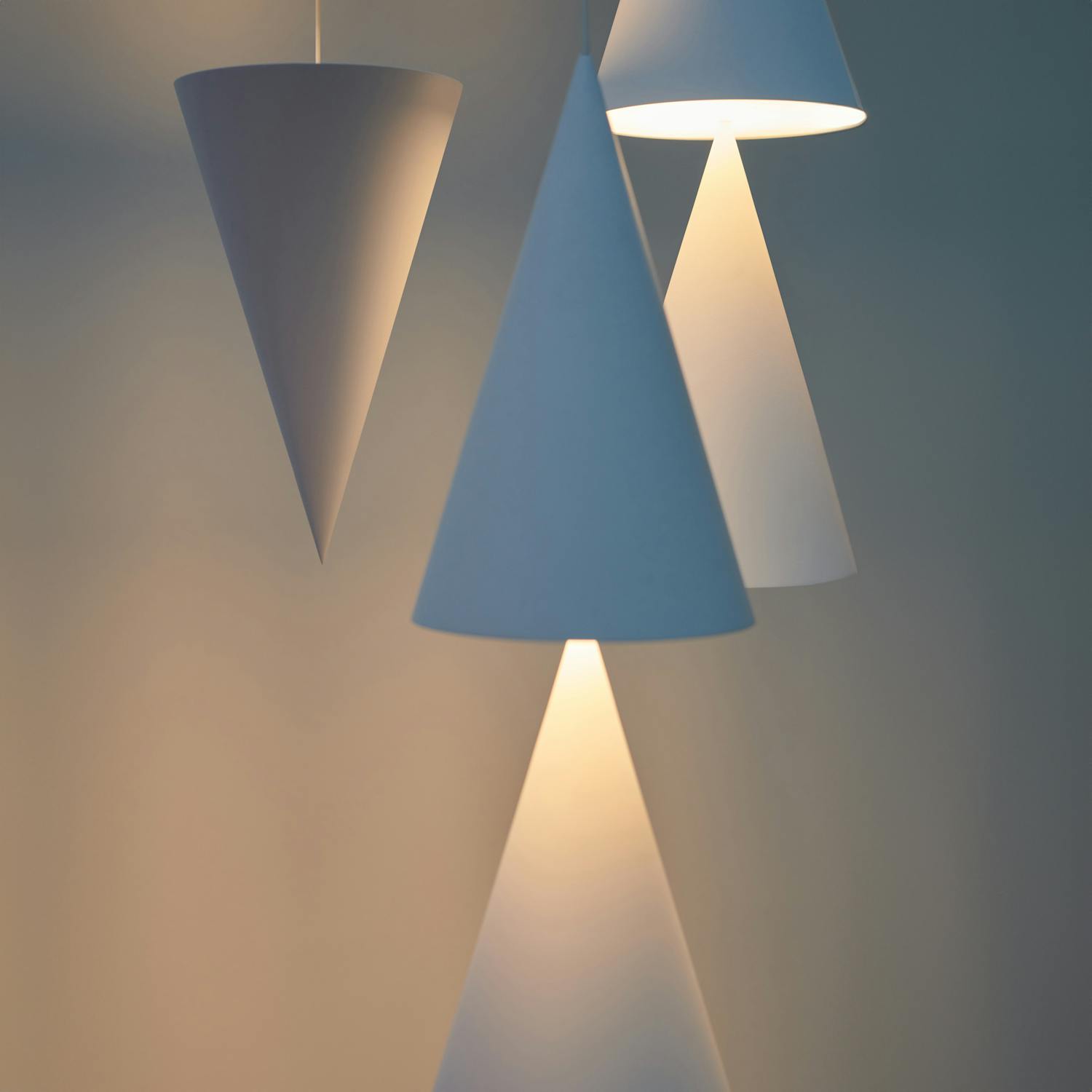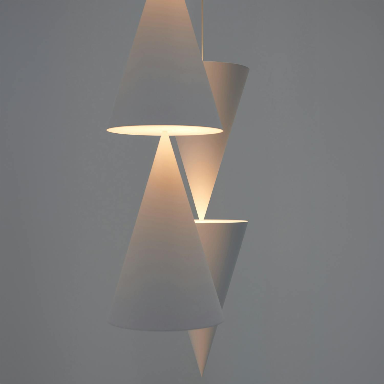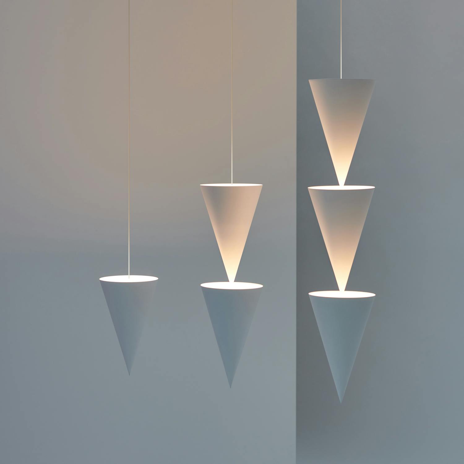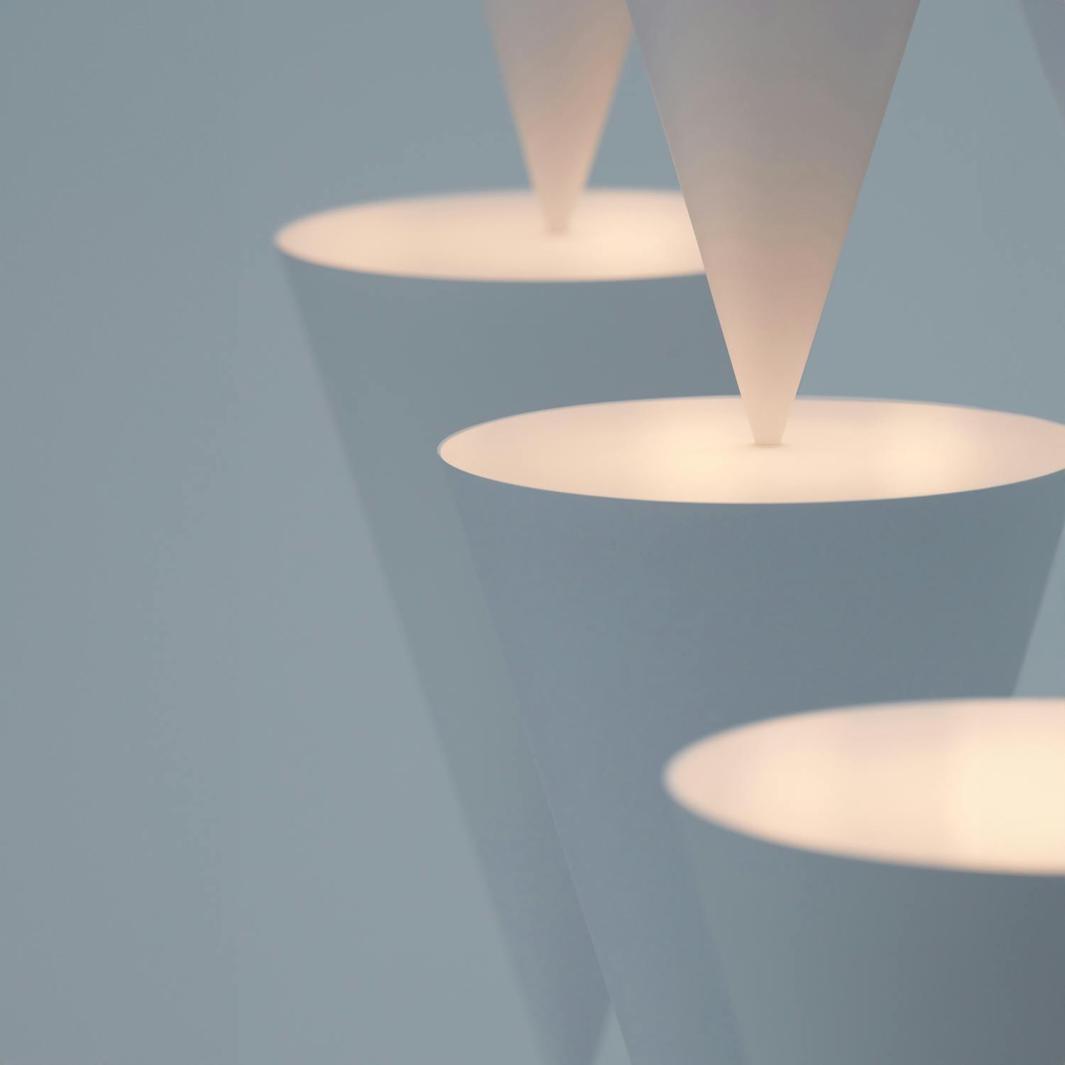 Peaks is a family of pendants, composed of a string of elongated cones in different configurations. The graded shading on the curved surface of each cone is as much of a feature as the projected beams emitted from each cone. It can be displayed as a single, double or triple arrangement, pointing up or down depending on the preferred direction of light. An identical inverted cone acts as a rose attached to the ceiling. When the light is off, the forms appear very schematic, as if borrowed from a geometric still life. When on, the shading changes, as light casts along the curved surface.