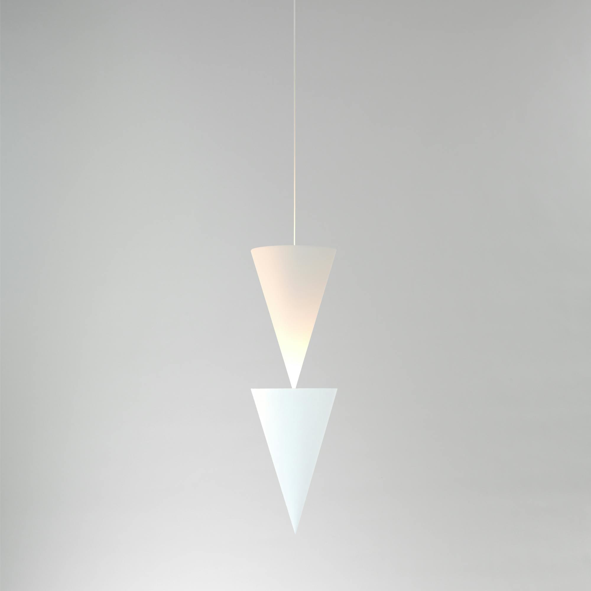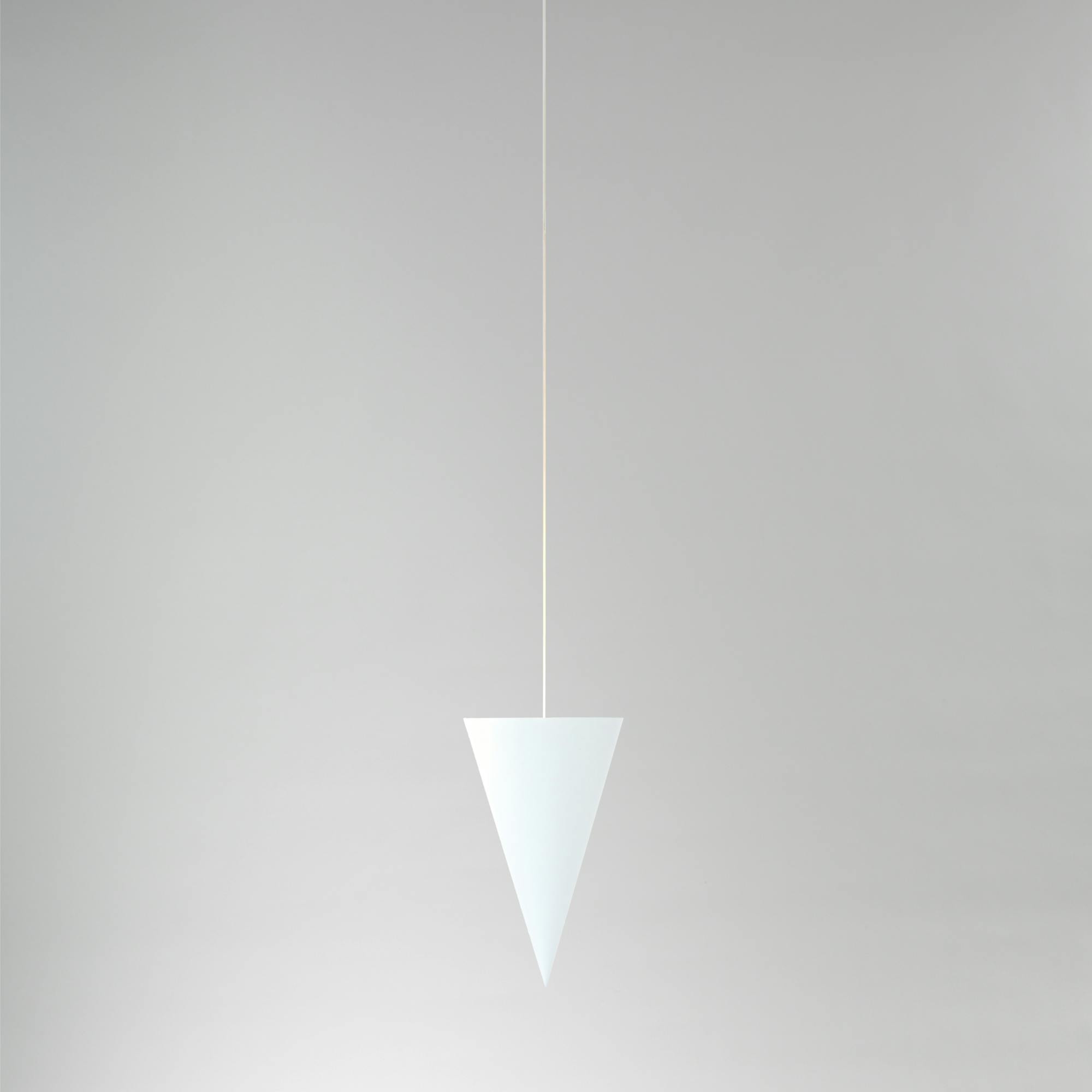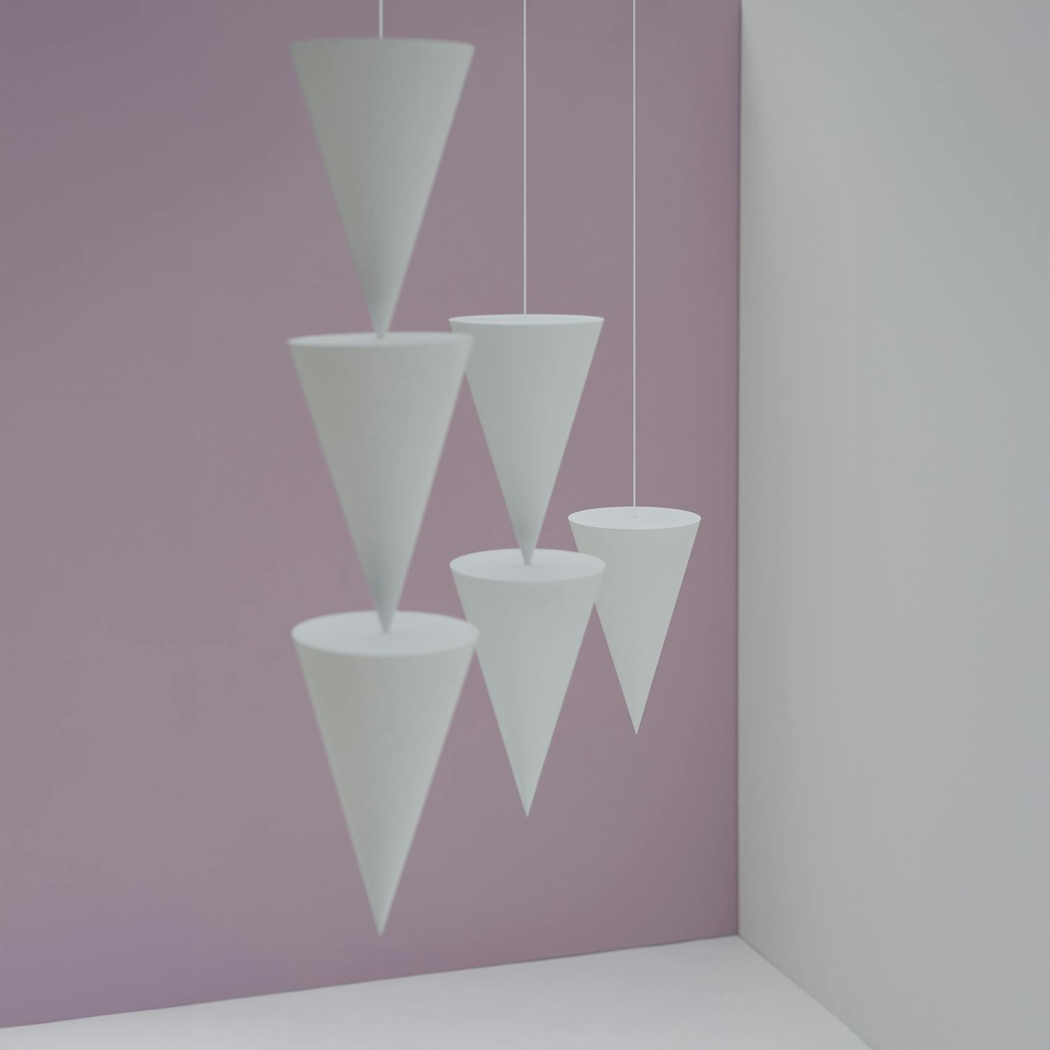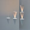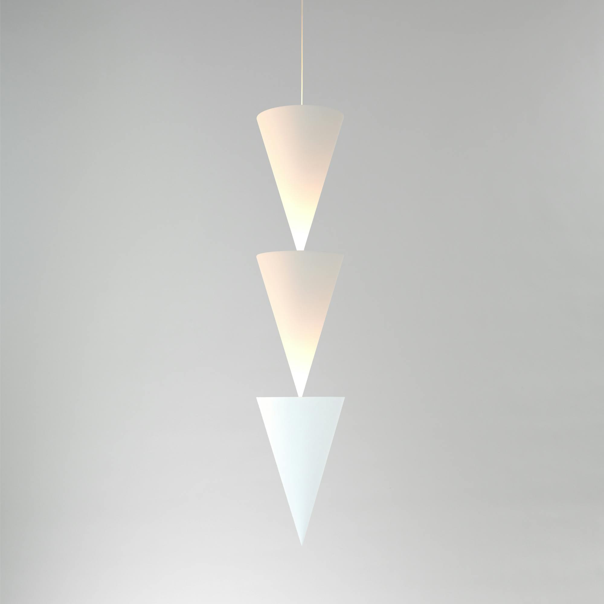 Peaks is a family of pendants, composed of a string of elongated cones in different configurations. The graded shading on the curved surface of each cone is as much of a feature as the projected beams emitted from each cone. It can be displayed as a single, double or triple arrangement, pointing up or down depending on the preferred direction of light. An identical inverted cone acts as a rose attached to the ceiling. When the light is off, the forms appear very schematic, as if borrowed from a geometric still life. When on, the shading changes, as light casts along the curved surface.