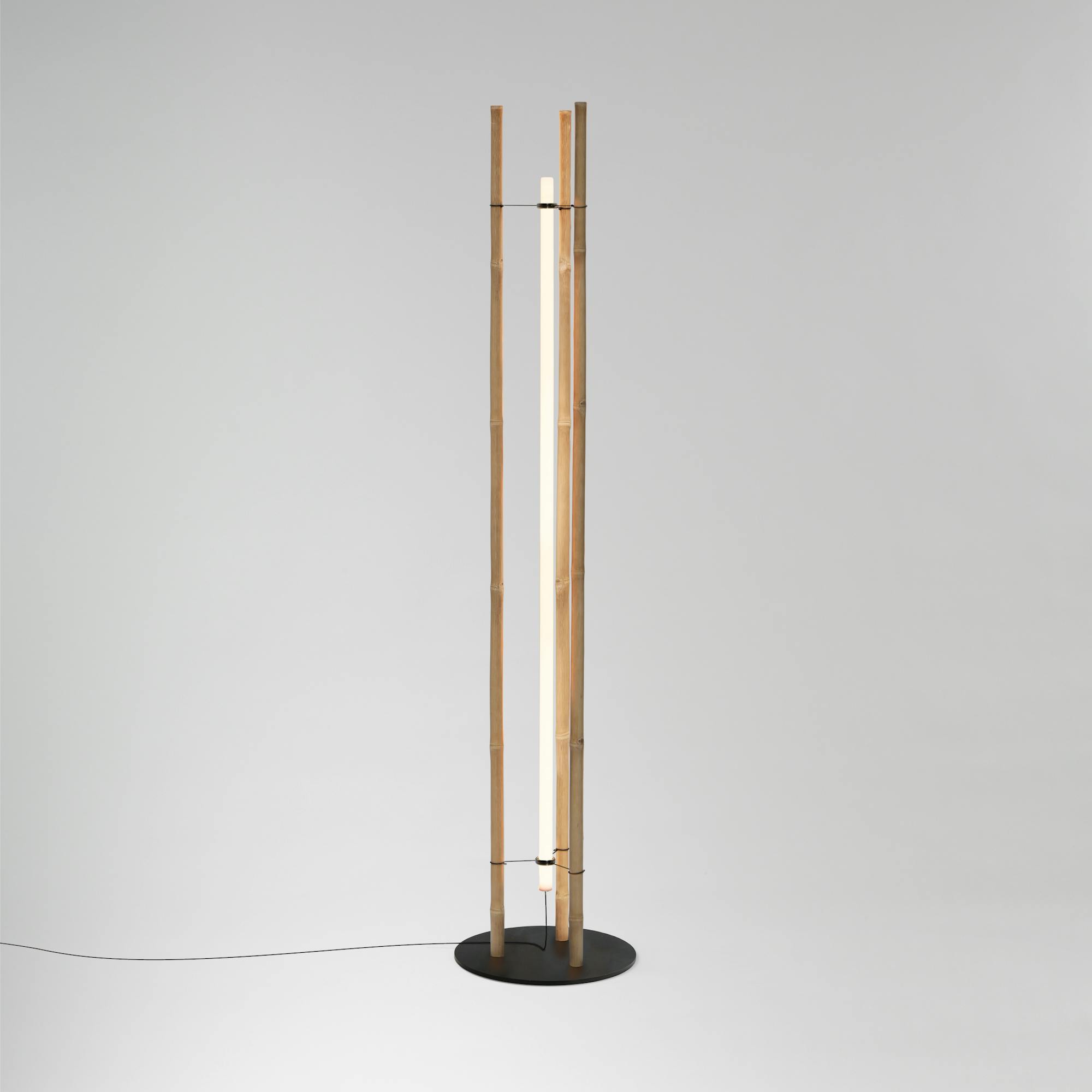 This family of floor lamps originated after the exhibition “Cheerfully optimistic about the future”, presented at the Fondazione ICA in Milan in September 2021. The idea was to produce a simplified unlimited version of the lights that carries the sophistication and craftsmanship with which the limited edition works were made. The result is an arrangement of beautifully crafted bamboo poles placed on a metal base, creating a structure that holds a linear bulb. The bulb is supported with a series of wire springs that wrap around the poles, suspended equidistant from them.