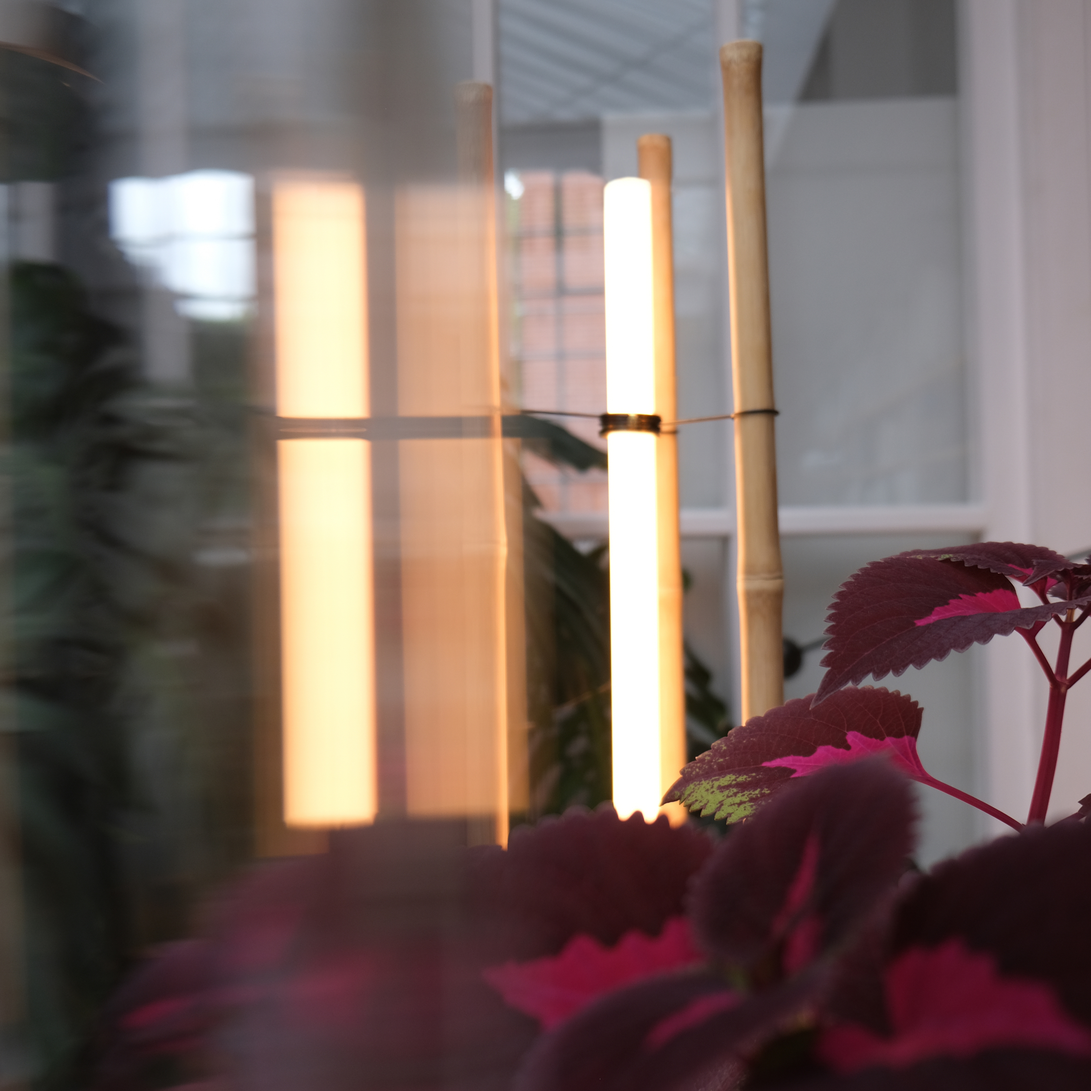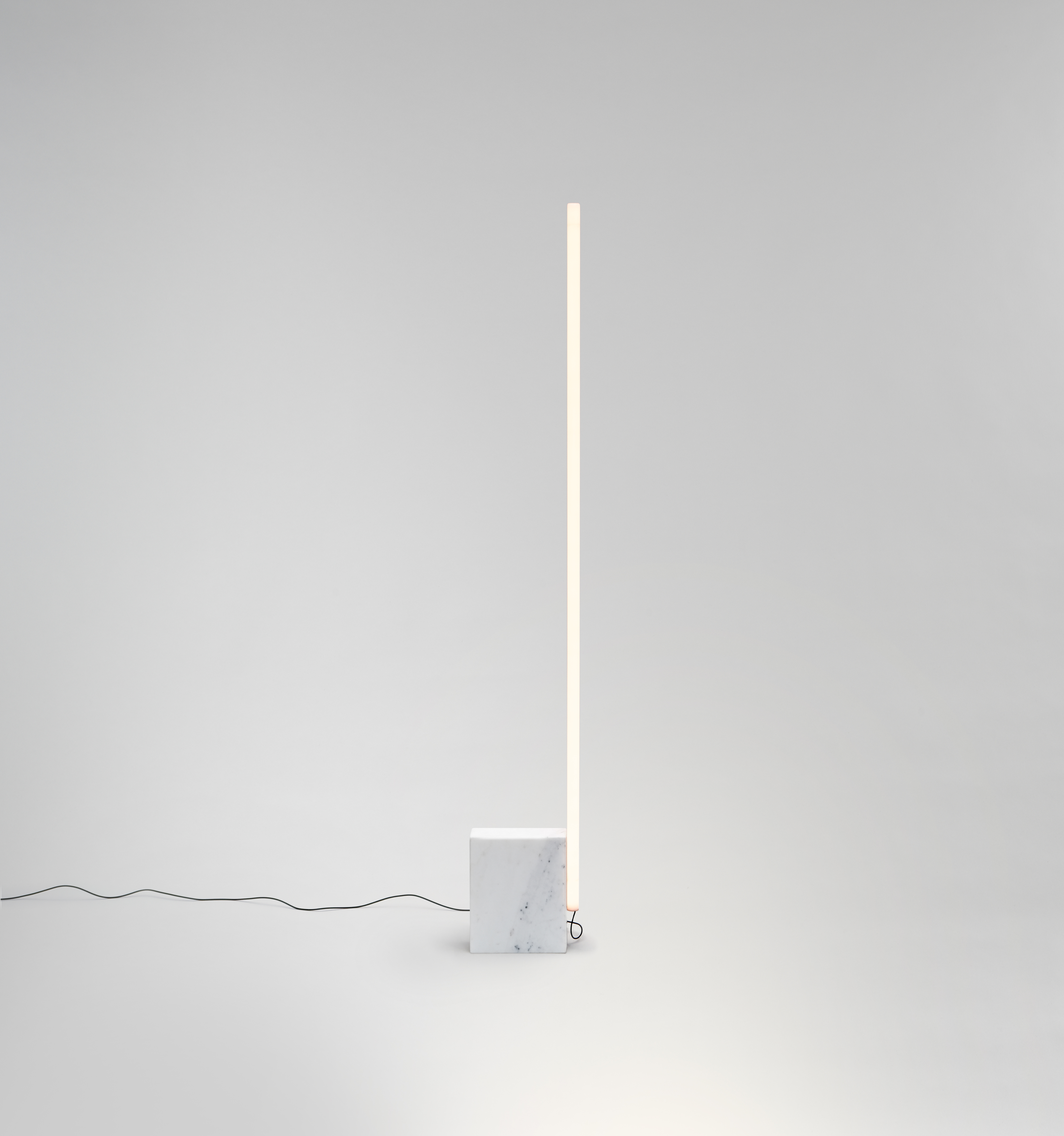 This family of floor lamps originated after the exhibition “Cheerfully optimistic about the future”, presented at the Fondazione ICA in Milan in September 2021. The idea was to produce a simplified unlimited version of the lights that carries the sophistication and craftsmanship with which the limited edition works were made. The result is an arrangement of beautifully crafted bamboo poles placed on a metal base, creating a structure that holds a linear bulb. The bulb is supported with a series of wire springs that wrap around the poles, suspended equidistant from them.