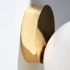 Tip of the Tongue consists of table lamp, wall lamp and ceiling-mounted sconce, all which feature an interesting illusion: a luminous mouth-blown opaline sphere appears to roll down the edge of a solid polished brass base. This delicate gesture of a sphere poised on the edge of the surface evokes the familiar phenomenon of failing to retrieve a word from memory, expressing a moment of tension in the form of the design.