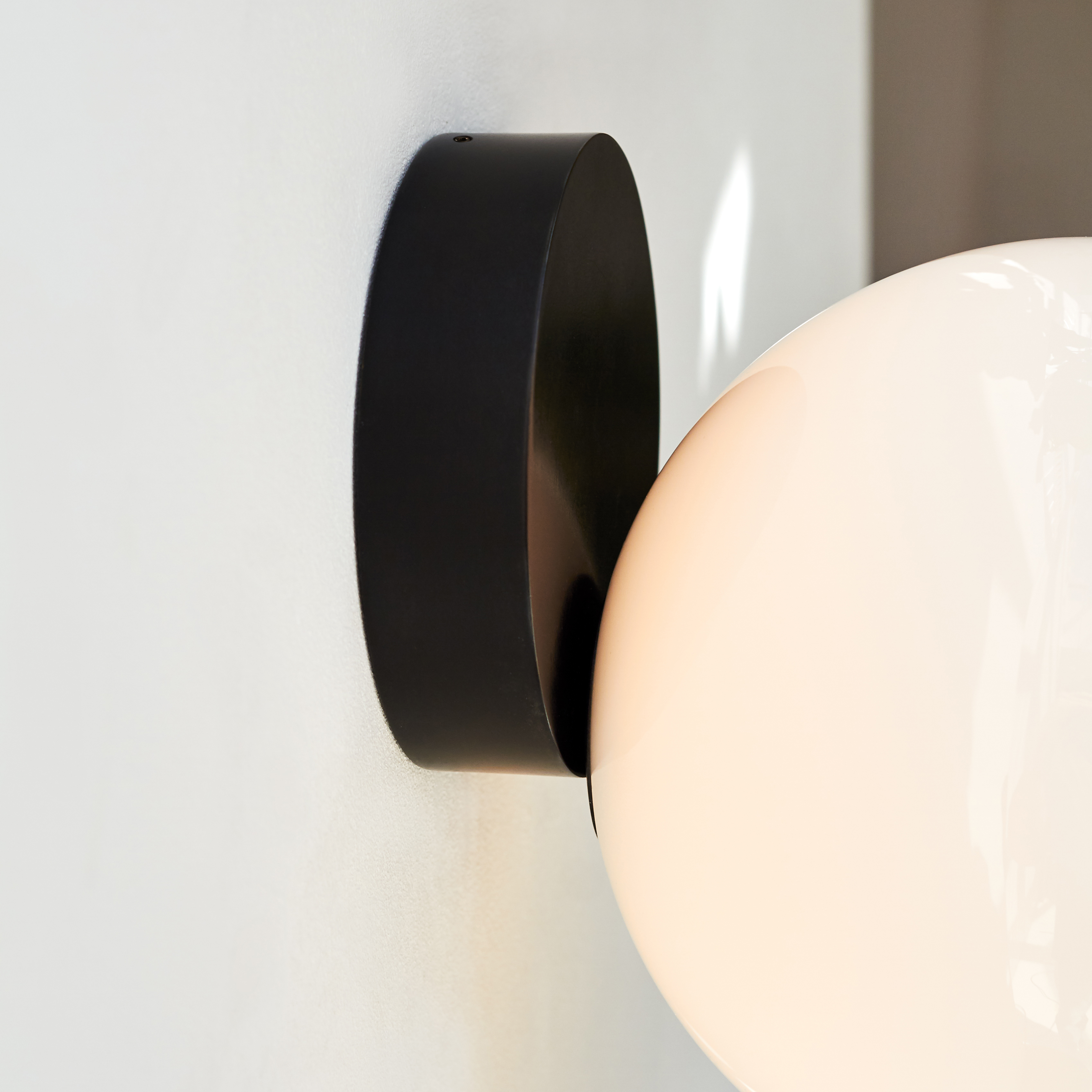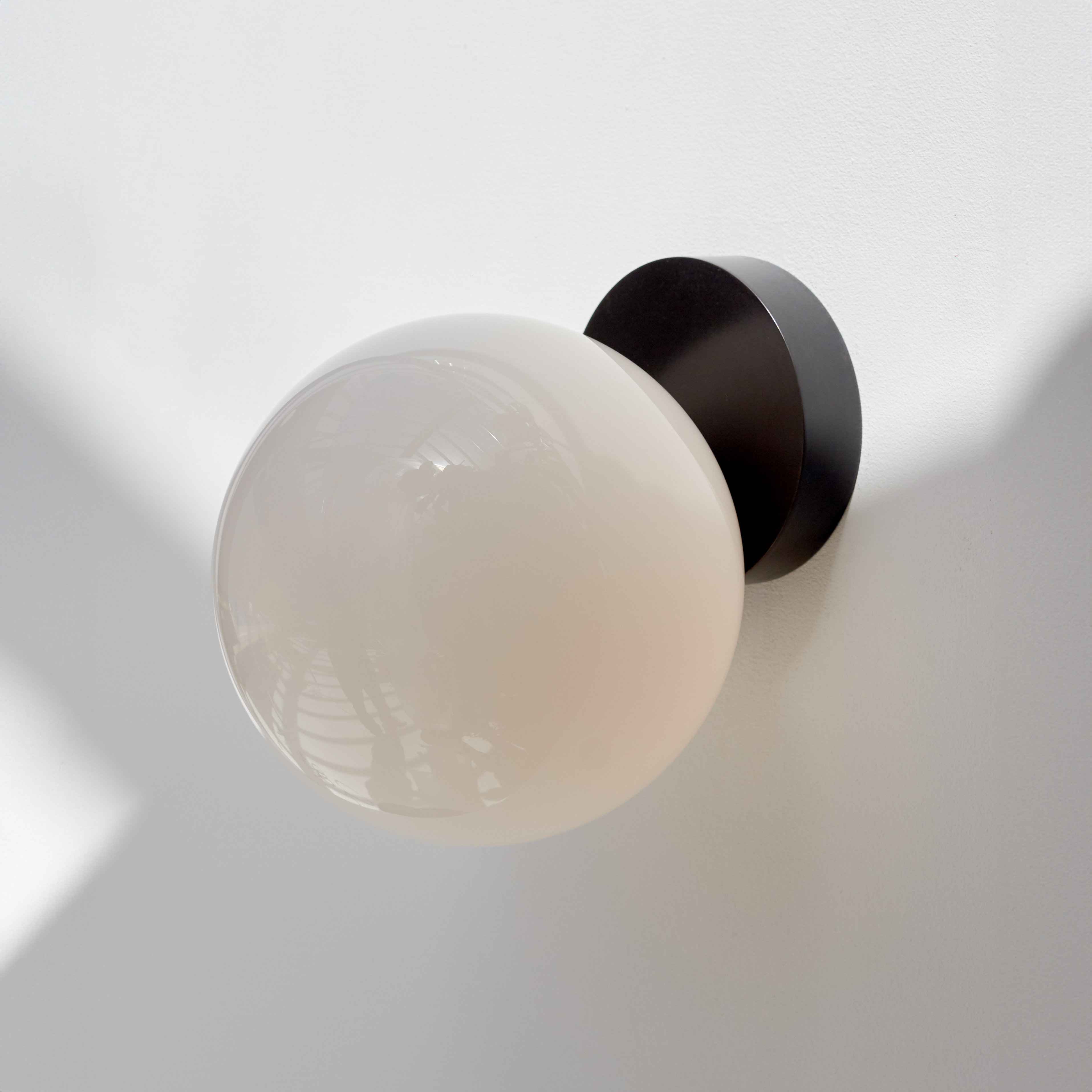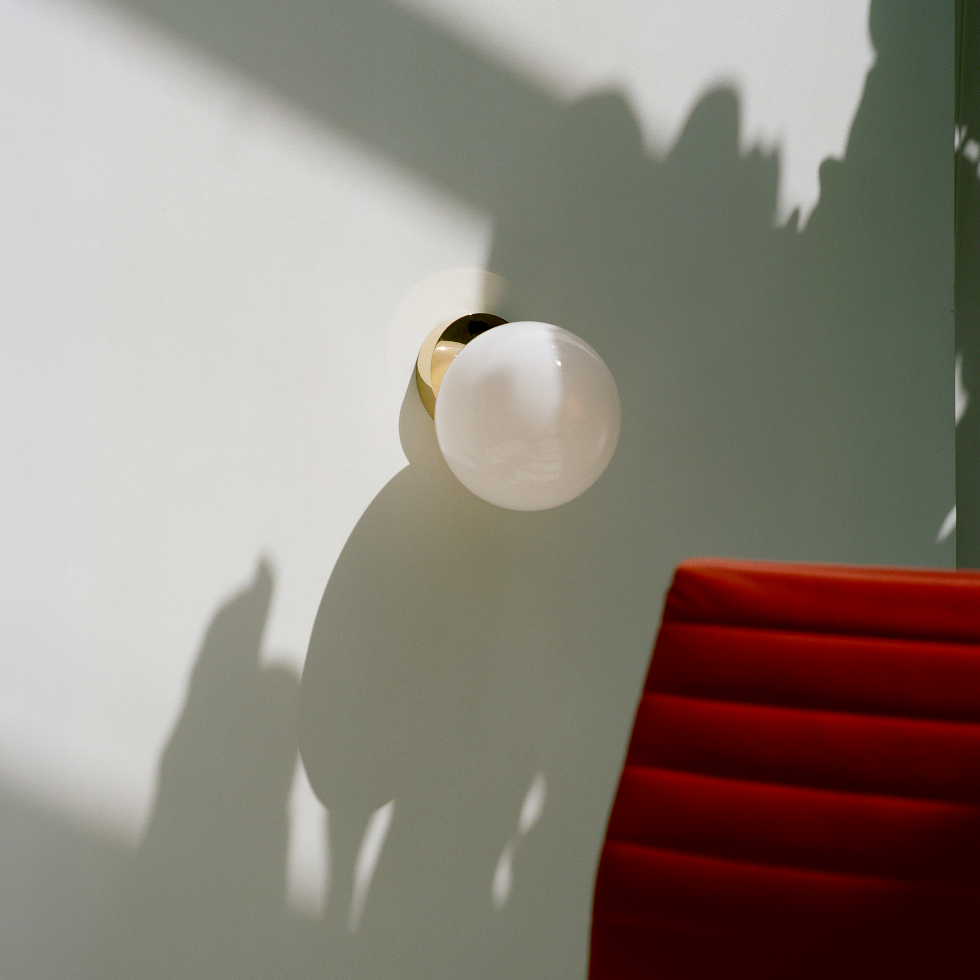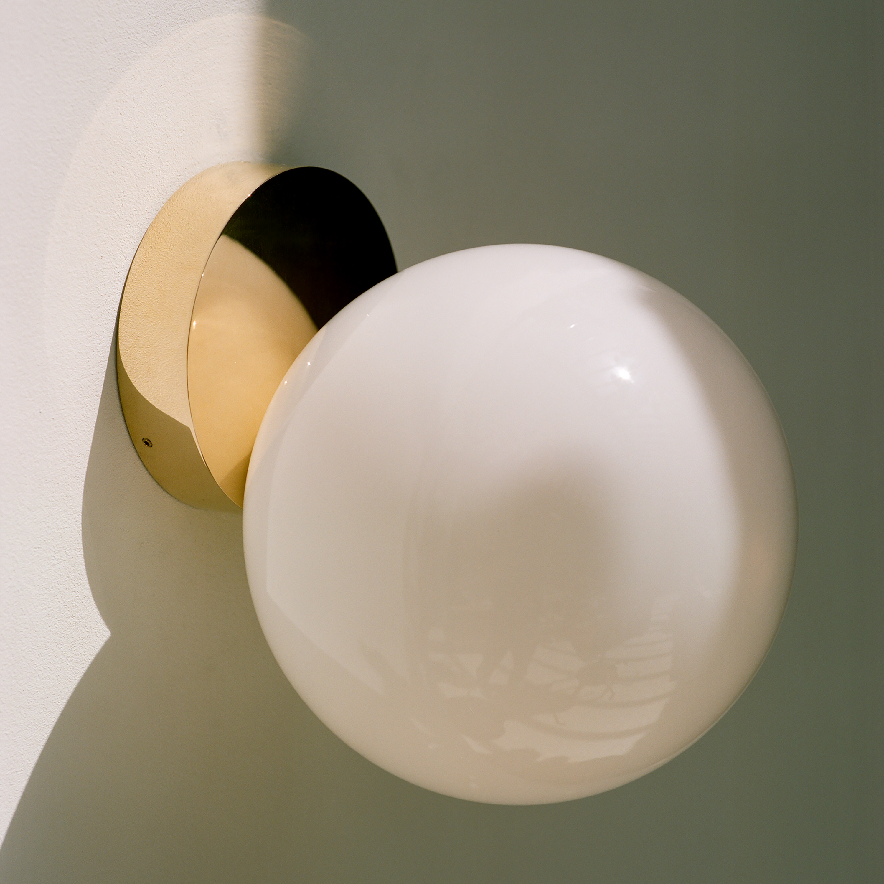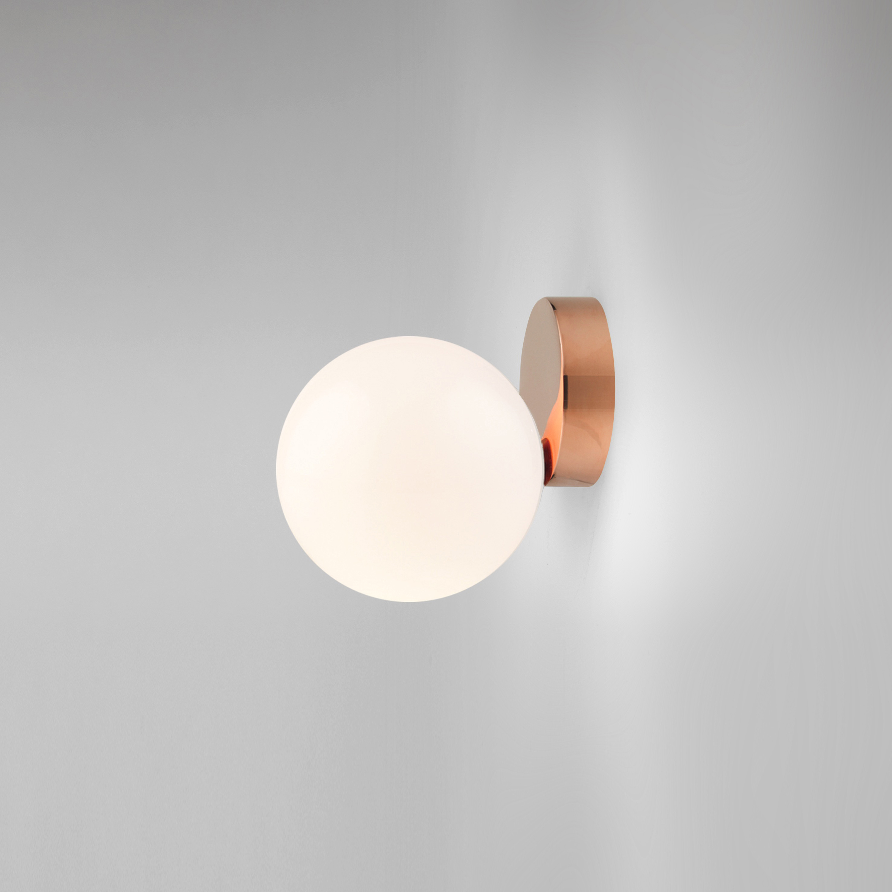 Tip of the Tongue consists of table lamp, wall lamp and ceiling-mounted sconce, all which feature an interesting illusion: a luminous mouth-blown opaline sphere appears to roll down the edge of a solid polished brass base. This delicate gesture of a sphere poised on the edge of the surface evokes the familiar phenomenon of failing to retrieve a word from memory, expressing a moment of tension in the form of the design.