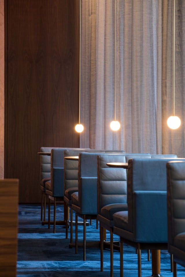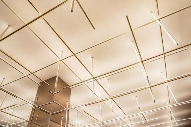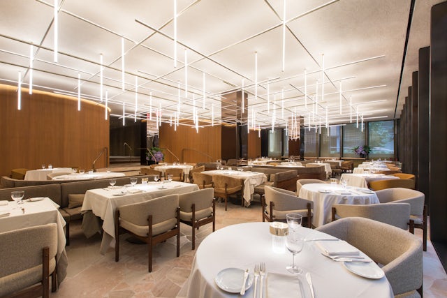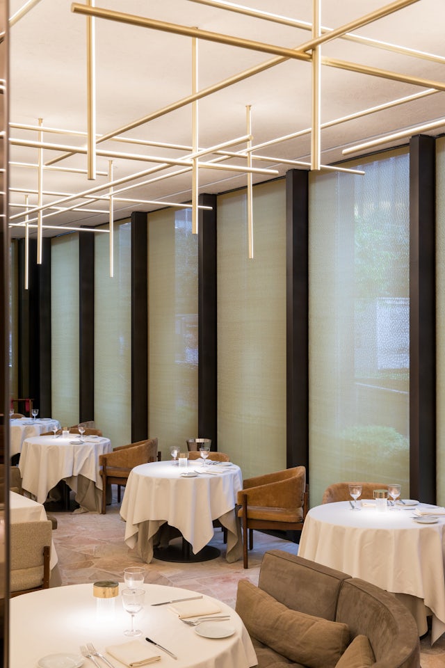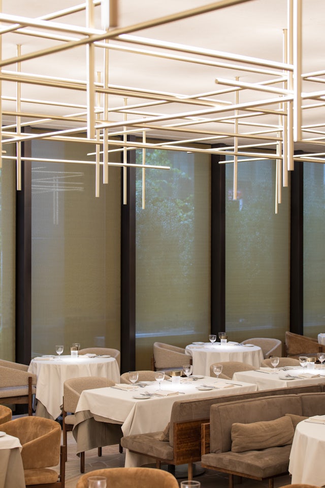 When The Four Seasons restaurant was relocated from the iconic Seagram Building to East 49th Street in New York, Michael Anastassiades was commissioned to design all the lighting fixtures for the interiors, devised by Brazilian architect Isay Weinfeld. For the ceiling, Anastassiades conceived a theatrical bespoke intervention using a geometric grid of vertical and horizontal strip lights.