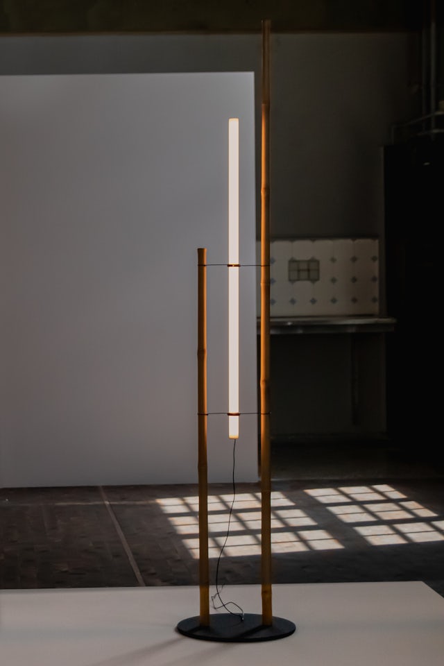 Both families evolved from the development of a custom linear LED bulb, an advanced re-design of the standard linear signature tube that the designer has been using since the creation of his brand in 2007. Each bulb is hand-built using an opaline borosilicate tube and illuminated using a smart arrangement of LEDs that emanate a warm, all-round illumination. The bulb is self-powered and can be used in a series of spontaneous configurations. As a result, these distinct families of floor lamps are a simple exercise of how to support the bulb in a vertical position.
