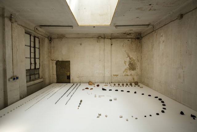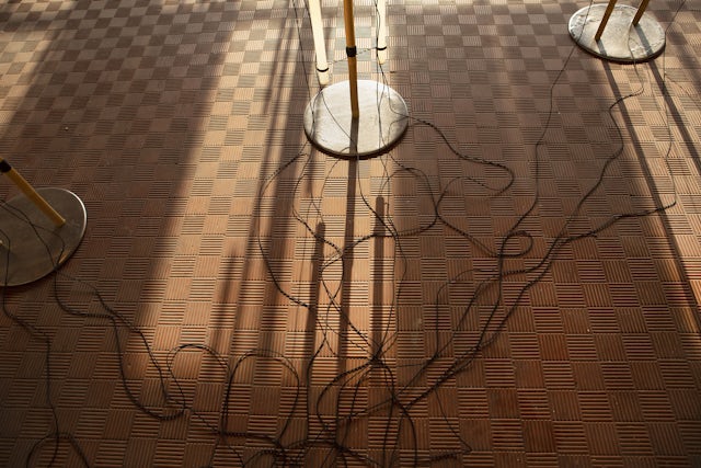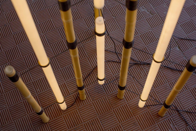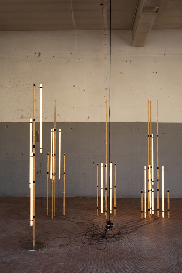 The exhibition occupies two different spaces of the Fondazione: the external room and the ground floor of the main building. The first one, poetically named the Glossary room, hosts a carefully laid out display of things that the artist had unearthed in nature or sourced from his own collections. Together, they form a constellation of objects that, placed in careful relation to one another, are part of the syntax of the whole project. In the main exhibition space instead, disseminated alone, in couple or in small groups following specific volumes and spatial rhythm, appear several sculptures accurately refined, providing a delicate bright surface. The backbone of the works’ realization is the bamboo, a new material for Anastassiades’ studio, which represents a departure from its usual language of geometric, controlled forms while the base is made of poured pewter, a metal chosen for its low melting point. The works produced for the exhibition embrace the material’s inherent irregularity, paired with an overall language of repeating, iterative configurations. Along with the use of natural materials such as bamboo or the linen thread, other details that do not try to hide the workings of the pieces are present, such as the exposed holders for the bulbs or the exposed connections and cables, elements that emphasize the dialogue between the components eliminating any possible hierarchy. According to Anastassiades’ minimalist aesthetic, the bulbs have the shape of pure cylinders of glass, which inevitably evoke the emblematic neon sculptures by Dan Flavin realized in the ‘60s.