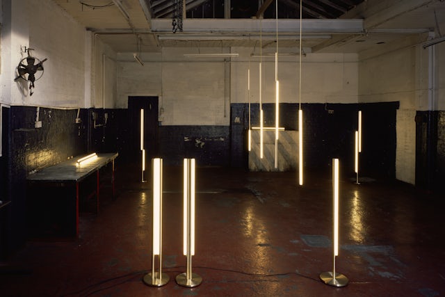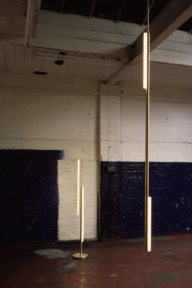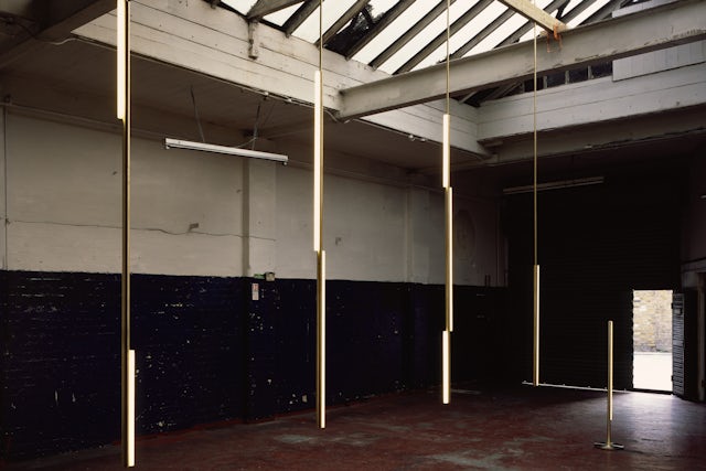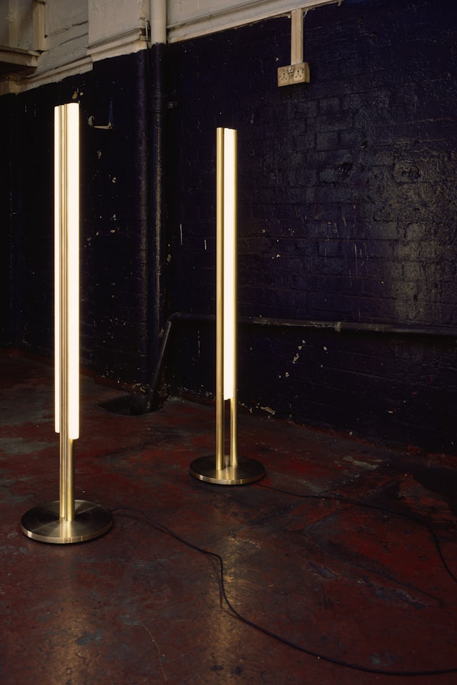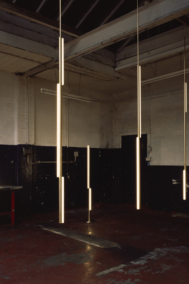 The lights posit various combinations of standard linear incandescent bulbs, either 1m or 0.5m long, with tubular brass fittings of the same diameter. They appear as parallel repetitions of rods, either metal or illuminated. The design process was systematic, with Anastassiades exploring all possible iterations determined by a mathematical sequence. The final cut, however, was made on purely aesthetic grounds. The 11 arrangements that went on to become the final series were chosen for their apparent effortlessness. Belying the complexity of their construction and the skills of the UK-based machinist who manufactured them, they look as though they came together by chance. Viewed asance, they could almost have been left behind by the building’s previous occupants.
