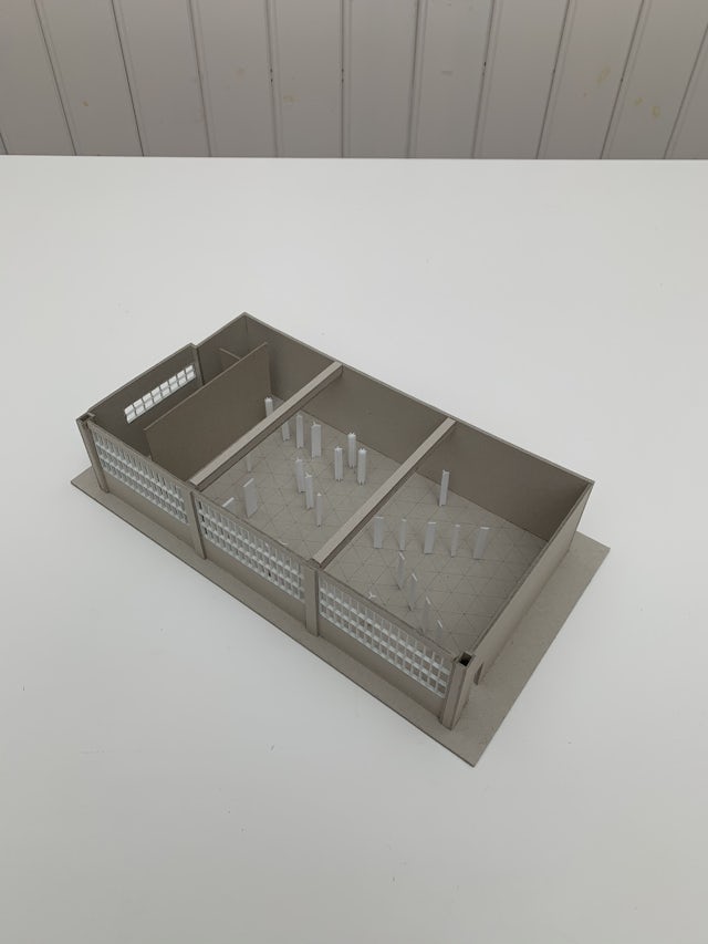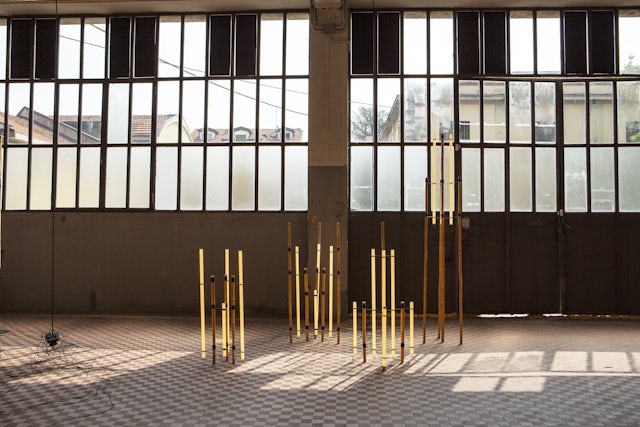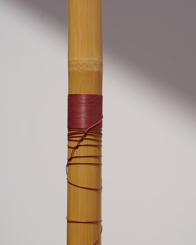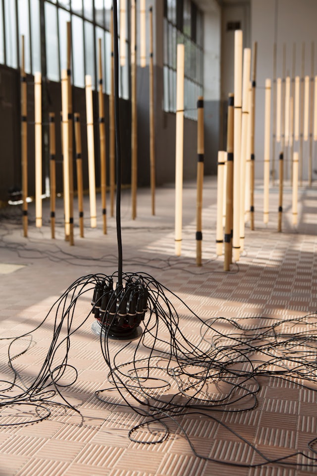 The works embrace the material’s inherent irregularity, paired with an overall language of repeating, iterative configurations. Along with the use of natural materials such as bamboo or the linen thread, other details that do not try to hide the workings of the pieces are present, such as the exposed holders for the bulbs or the exposed connections and cables, elements that emphasize the dialogue between the components eliminating any possible hierarchy.
