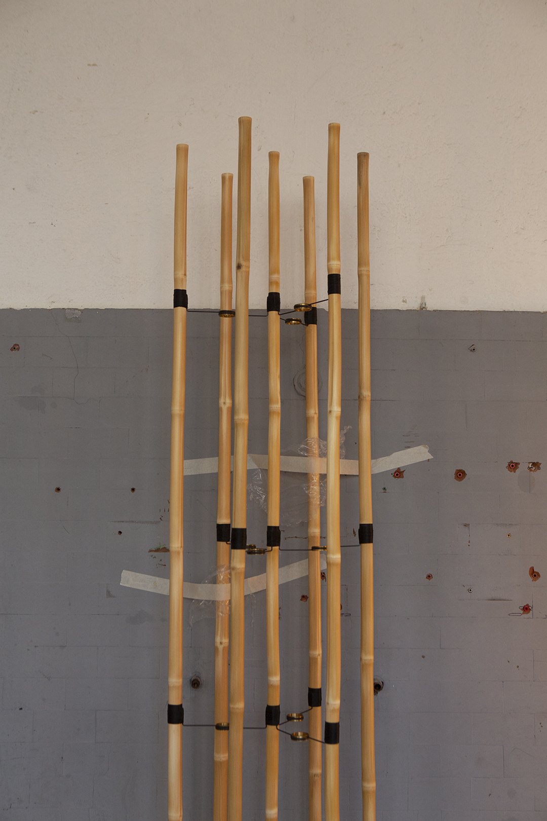 The works embrace the material’s inherent irregularity, paired with an overall language of repeating, iterative configurations. Along with the use of natural materials such as bamboo or the linen thread, other details that do not try to hide the workings of the pieces are present, such as the exposed holders for the bulbs or the exposed connections and cables, elements that emphasize the dialogue between the components eliminating any possible hierarchy.